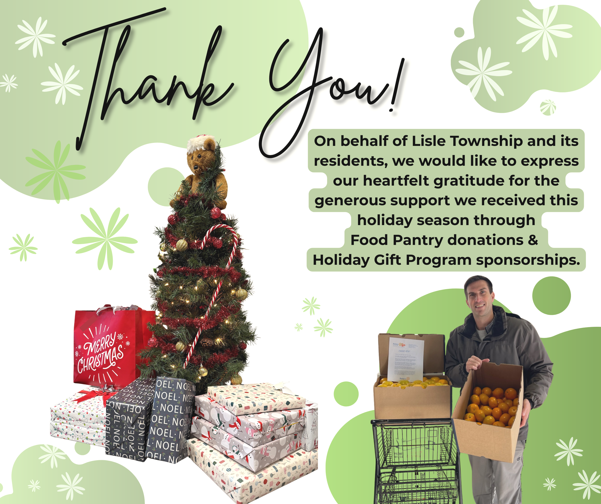 Lisle Township would like to express our sincere gratitude to all the partnering organizations, community members, volunteers, donors, and staff who generously contributed to our Food Pantry and/or sponsored a family through our Holiday Gift Program. This year, our community truly went above and beyond to support residents in need.