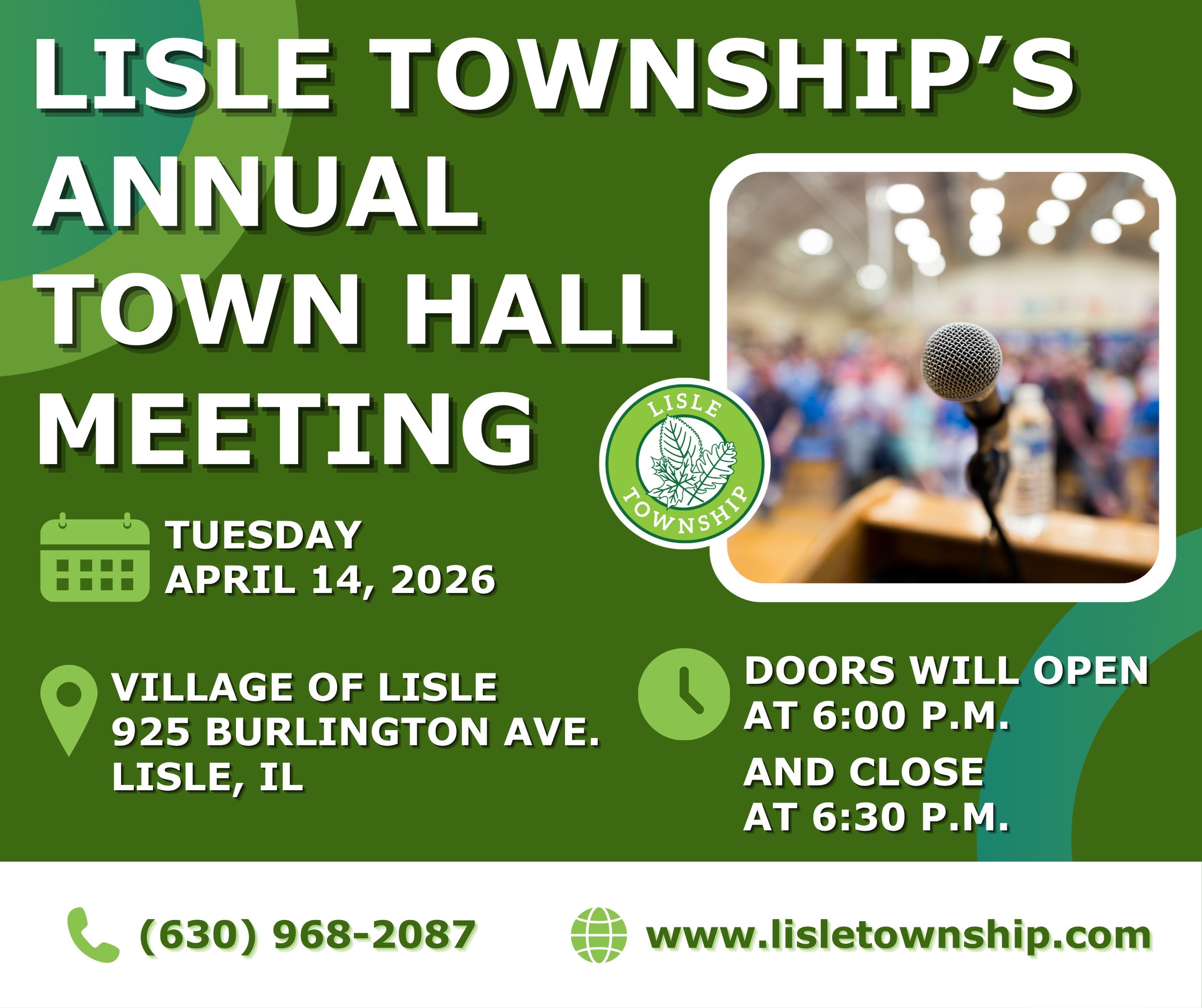 Join us on Tuesday, April 14, 2026 at 6:30 p.m. for the Lisle Township Annual Town Hall meeting. This meeting will take place at the Village of Lisle located at 925 Burlington Avenue, Lisle, IL.