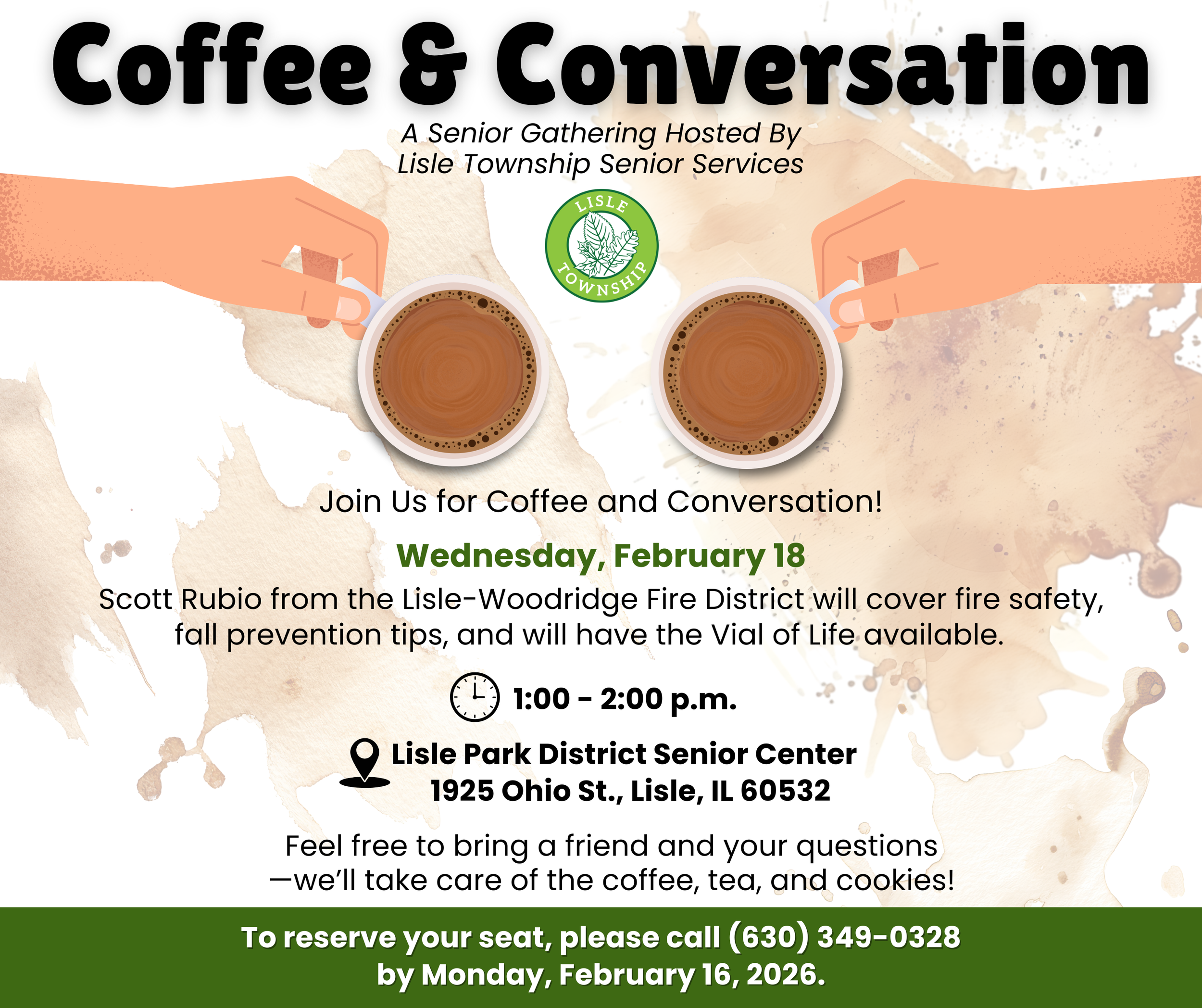 Coffee & Conversation: A Senior Gathering Hosted by Lisle Township Wednesday, February 18, 2026 1:00 PM 2:00 PM Lisle Park District Senior Center 1925 Ohio Street Lisle, IL, 60532 United States (map) Google Calendar ICS Join Us for Coffee and Conversation! This month we will be joined by Scott Rubio from the Lisle-Woodridge Fire District. Scott will cover fire safety, fall prevention tips, and will have the Vial of Life available.