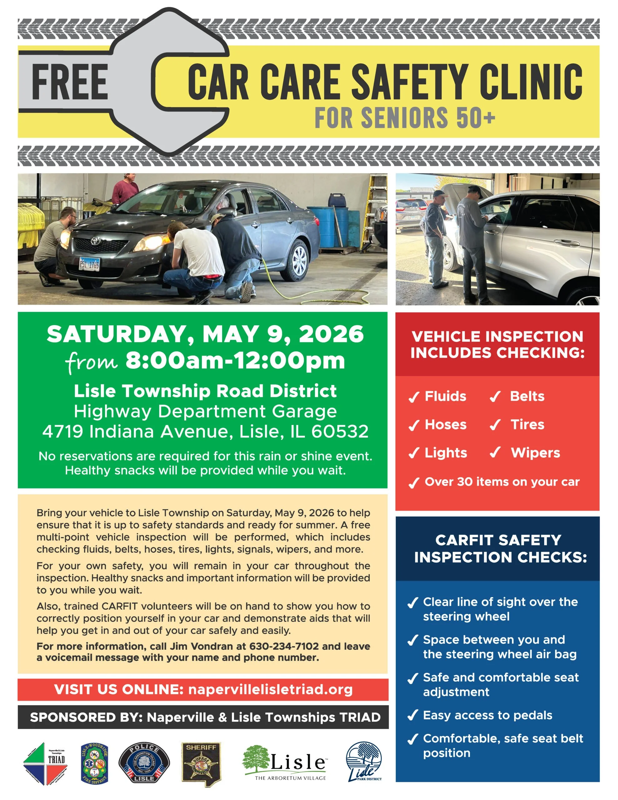 Bring your vehicle to Lisle Township on Saturday, May 9, 2026 to help ensure that it is up to safety standards are ready for summer. A free multi-point vehicle inspection will be performed, which includes checking fluids, belts, hoses, tires, lights, signals, wipers, and more.