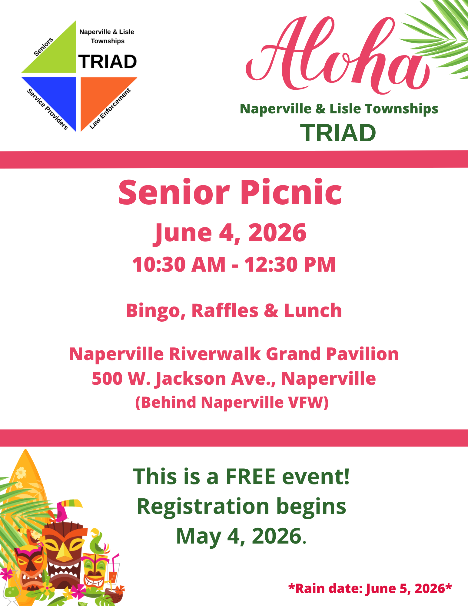 Aloha Senior Picnic hosted by Naperville & Lisle Townships TRIAD Thursday, June 4, 2026 10:30 AM 12:30 PM Naperville Riverwalk Grand Pavilion 500 Jackson Avenue Naperville, IL, 60540 United States (map) Google Calendar ICS Join Naperville & Lisle Townships TRIAD for a Senior Picnic, tiki style! Bingo, raffles, & lunch! This is a free event and registration begins May 4, 2026 by visiting: https://napervillelisletriad.org/