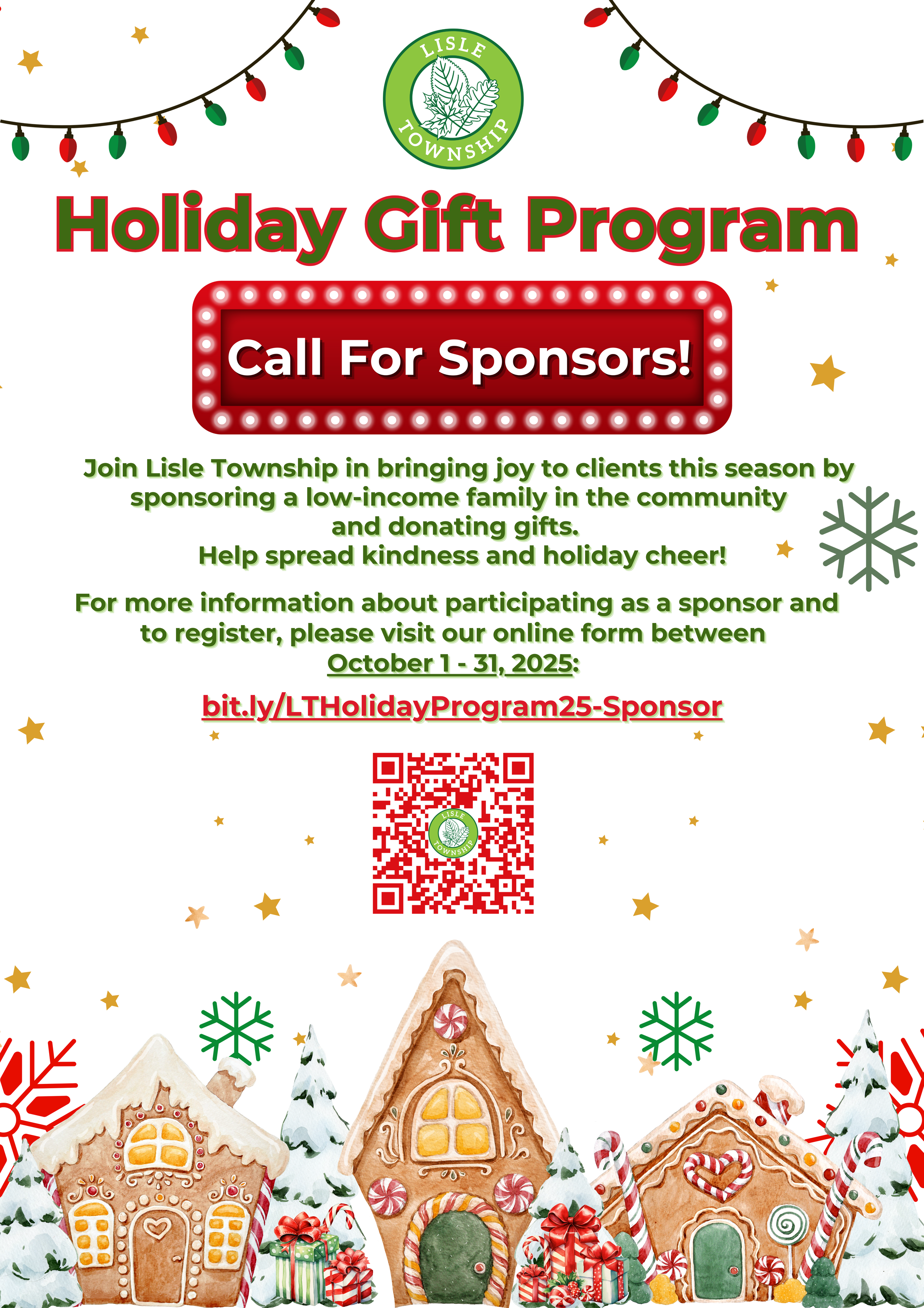 Join Lisle Township in bringing joy to clients this season by sponsoring a low-income family in the community and donating gifts from their wish lists. Help spread kindness and holiday cheer this year! Fill out the registration form by clicking the button below if you’d like to become a sponsor this holiday season.